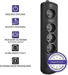 Ovládání je maximálně pohodlné díky podsvícenému nožnímu vypínači Quick Switch – jedním stiskem vypnete či zapnete napájení všech připojených zařízení. Bezpečnost zajišťují přepěťové prvky (varistor), dětské krytky ve všech zásuvkách a nehořlavé provedení z PP.