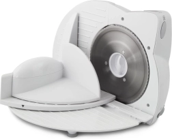 Kompaktní elektrická kráječka s výkonem 150 W vám umožní krájet pečivo, uzeniny, sýry, ovoce i zeleninu na rovnoměrné plátky. Díky široké regulaci tloušťky si snadno nastavíte ideální řez pro každý typ potravin. O vaši bezpečnost se stará bezpečnostní zámek a stabilitu při práci zajišťují protiskluzové přísavky.