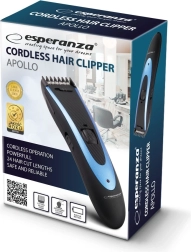 Bezdrátový zastřihovač vlasů ESPERANZA Apollo pro rychlé a pohodlné stříhání doma. Nabízí až 24 délek střihu v rozsahu 1,5–24 mm, ergonomický tvar a snadné ovládání. Ušetřete čas i peníze a vytvořte si precizní účes i úpravu vousů kdykoli.
