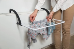 Sušák na radiátor s odolnými raménky, který lze zavěsit i na balkon. Ideální pro malé každodenní praní. Má nastavitelná a skládací ramena z plastu, vybavená ochrannými kryty proti poškrábání povrchů při používání.