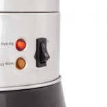 Zařízení je navrženo pro bezpečné a pohodlné používání: termoizolační rukojeti se nezahřívají, stabilní základna s ovládacím panelem nabízí přepínač a světelné indikace Heating/Keep Warm. Nerezová konstrukce je odolná a snadno se čistí, takže je vhodná pro intenzivní provoz v gastronomii i kancelářích.