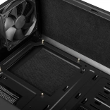 Vnitřní prostor je navržen pro a flexibilitu: podpora chlazení až pěti ventilátory (2× předek, 2× vrch, 1× zadní – 2× 120 mm instalovány z výroby), kompatibilita s vodním chlazením a promyšlené tunelové zakrytí pro PSU a 3,5" disky. Snadno odnímatelné prachové filtry (horní magnetický, spodní u zdroje i přední) udržují čistotu a stabilní teploty.