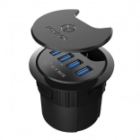 Kruhové tělo navržené pro standardní otvor ve stole umožňuje rychlou instalaci bez nářadí. Prachová krytka udrží porty čisté a pracovní plochu úhlednou.