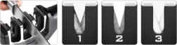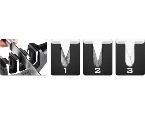 Vylepšete výkon svých kuchyňských nožů pomocí 3stupňového ostřiče, který spojuje rychlost, přesnost a šetrnou údržbu. První stupeň s diamantovým kamenem opraví poškození a srovná ostří. Druhý stupeň s wolframovou (karbidovou) brusnou částí vytvaruje ostrý V profil. Třetí stupeň s keramickým kamenem dodá čepeli hladkost a dlouhotrvající ostrost.