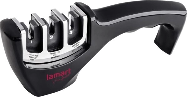 Univerzální 3stupňový ostřič nožů pro rychlé a bezpečné broušení kuchyňských nožů z nerezové oceli. Kombinuje diamantový kámen pro opravu a srovnání ostří, wolframový (karbidový) kotouč pro vytvoření přesného V profilu a keramický kámen pro finální leštění a vyhlazení. Ideální pro každodenní údržbu i obnovu více opotřebených čepelí.