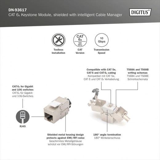 Ekranovaný modul Keystone DIGITUS CAT 6A je navržen pro montáž bez použití nástrojů, což zajišťuje snadnou a rychlou instalaci. Splňuje normy ISO/IEC 60603-7-51,11801 a AMD2:2010-04. Systém LSA list je barevně kódován podle EIA/TIA 568 A&B, což zajišťuje kompatibilitu a spolehlivost. Díky své kompaktní konstrukci je také kompatibilní s designově kompatibilními modulárními zásuvkami.