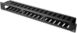 Tři široké průchody o rozměrech 30 × 130 mm usnadňují organizaci a odlehčení kabelů, zlepšují proudění vzduchu a přispívají k čistému, profesionálnímu vzhledu instalace. Černé provedení RAL 9005 perfektně ladí s většinou rackových komponentů.