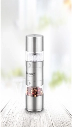 Ruční mlýnek na koření je elegantní a praktický nástroj pro každou kuchyni. Vyroben ze stříbrného kovu a průhledného plastu, nabízí dva oddělené prostory pro sůl a pepř, což umožňuje lepší kontrolu nad kořením.