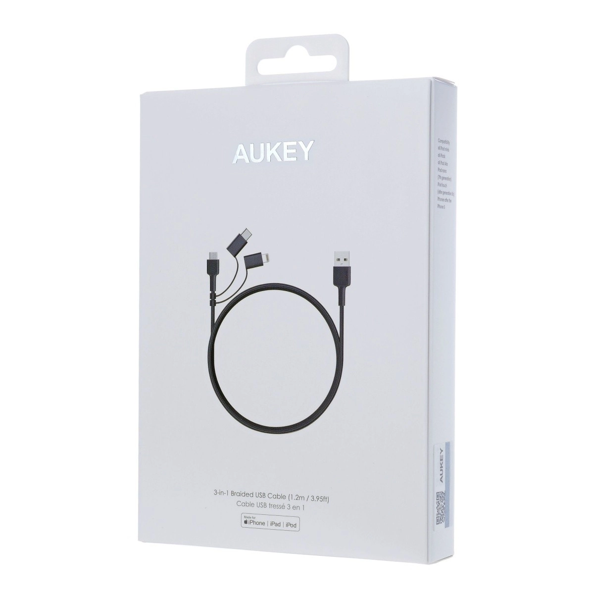 Univerzální 3v1 kabel od AUKEY s konektory Lightning (MFi), USB‑C a micro USB umožní rychlé nabíjení i synchonizaci dat jedním kabelem. Díky odolnému nylonovému opletu, vícevrstvovému stínění a délce 1,2 m je ideální pro každodenní použití doma, v kanceláři i na cestách. Podpora Quick Charge 3.0/2.0/1.0 a AiPower zajistí spolehlivý výkon pro širokou škálu zařízení.