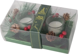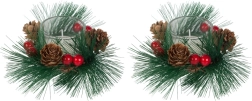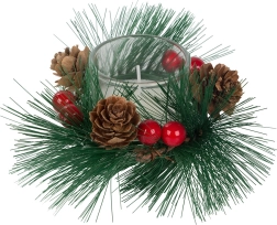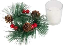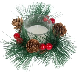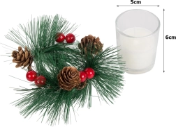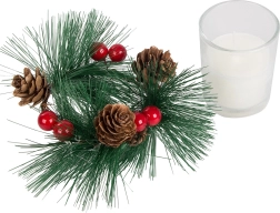 Tyto dekorativní svíčky ve stylu vánočního věnce jsou dokonalým doplňkem pro váš sváteční stůl nebo poličku. Borovicové větvičky, šišky a červené bobule kolem skleněného svícnu přidávají na přirozeném vánočním kouzle.