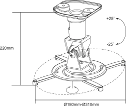 Pro přesné nasměrování obrazu lze držák naklopit o ±25°, pootočit o 360° a díky nastavitelným kovovým ramenům přizpůsobit rozteč uchycení v rozsahu 180–310 mm.