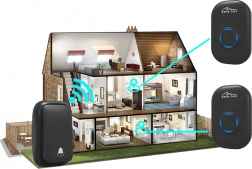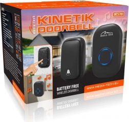 Bezdrátový a bezbateriový zvonek do dveří s kinetickým tlačítkem a dosahem až 150 m. Nabízí 51 melodií, 4 úrovně hlasitosti včetně ztlumení a venkovní tlačítko s IP44 pro spolehlivý provoz za každého počasí.