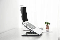 Praktický stojan na notebook nejen šetří místo na vašem stole, ale také zlepšuje komfort při práci. Díky pětistupňovému nastavení úhlu si snadno přizpůsobíte polohu notebooku podle vašich potřeb a předcházíte tak bolestem krční páteře. Otevřená konstrukce podporuje průtok vzduchu, což zajišťuje ochlazení vašeho zařízení a chrání ho před přehříváním.