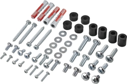 V balení najdete kompletní montážní sadu včetně prémiových hmoždinek Fischer a šablony pro vrtání – montáž je rychlá a přesná.