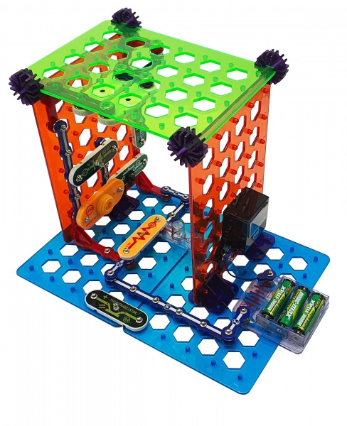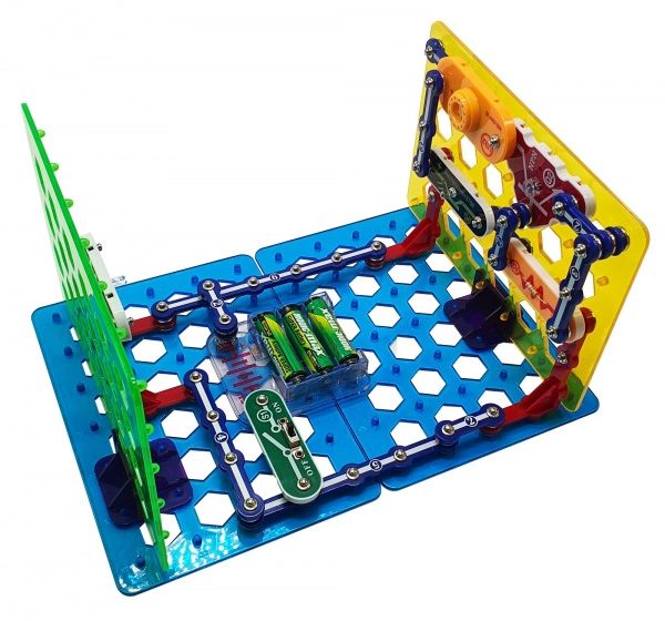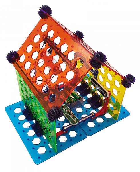 Stavebnice BOFFIN II Můj dům je ideální pro děti od 8 let, které chtějí pochopit principy elektřiny a chytré domácnosti. Základ tvoří děrovaná deska, na kterou se díly jednoduše nacvakávají – bez pájení, bezpečně a s okamžitým výsledkem. Postavíte osvětlení, alarm, dvoupatrový dům, větrný mlýn i party dům a ověříte si funkčnost podle přiložených schémat.