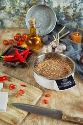 Praktická elektronická kuchyňská váha s maximální nosností 5 kg a přesností 1 g pro přesné pečení i zdravé vaření. Díky nerezové míse se snadno čistí, má velký čitelný displej, funkci tara, automatické i manuální vypnutí a umí měřit objem vody a mléka.