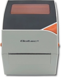 Qoltec label printer s elegantním designem a oranžovým prvkem kolem tlačítka 'FEED' vyniká svou funkčností při tisku etiket a čárových kódů.