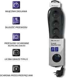 Bezpečnost je na prvním místě: přepěťová ochrana (varistor) chrání vaši elektroniku před napěťovými špičkami, dětské krytky ve všech zásuvkách zvyšují bezpečí v domácnosti a nehořlavý PP materiál přidává další úroveň ochrany. Výrobce si vyhrazuje právo na změnu technických parametrů.