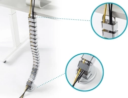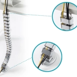 Tato elastická kabelová maska ve tvaru „páteře“ elegantně skryje a uspořádá kabely od podlahy ke stolové desce. Díky modulární konstrukci lze snadno zkrátit nebo prodloužit její délku podle výšky stolu až do 130 cm. Zatížená základna drží spirálu stabilně na podlaze, zatímco flexibilní články se plynule skládají při spouštění výškově nastavitelného stolu.