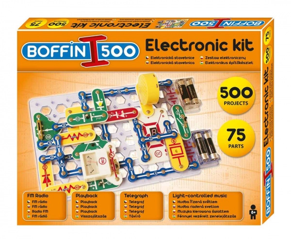 Stavebnice BOFFIN I 500 je komplexní sada pro zábavné učení elektroniky. Jednotlivé díly jednoduše nacvaknete na základní desku a podle návodů postavíte projekty jako FM rádio, telegraf, hlasem a dotykem řízenou hudbu, ptačí zpěv či zvuky sirén. Každý projekt je jasně popsán – co má dělat, jak funguje a jak zkontrolovat výsledek.