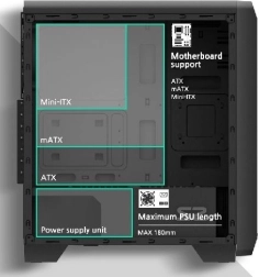 - Kompatibilita základních desek: ATX, Micro‑ATX, Mini‑ITX
