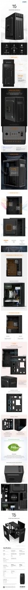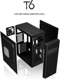 Elegantní mid‑tower skříň T6 pro základní desky ATX nabízí optimalizované chlazení s přední mřížkou, předinstalovaným 120mm zadním ventilátorem a horní montáží PSU. Odolná prášková povrchová úprava, podpora chladiče CPU do 165 mm a grafické karty do 280 mm dělají z T6 skvělý základ pro spolehlivý a dobře větraný počítač.