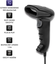Skener čárových kódů Qoltec je navržen pro maximální efektivitu a spolehlivost. Umožňuje skenování 1D a 2D kódů s rychlostí 300 skenů za sekundu a pracovní vzdáleností až 100 m od přijímače. Přístroj je odolný vůči pádům z výšky 1,5 m a umožňuje skenování kódů v různých úhlech, včetně těch obrácených.