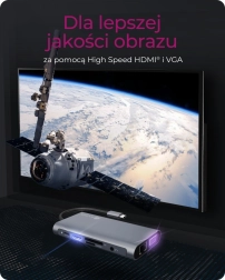 Připojte monitor přes HDMI v rozlišení až 4K@30 Hz nebo přes VGA v rozlišení až 1080p@60 Hz. Ideální pro prezentace i rozšířenou plochu.