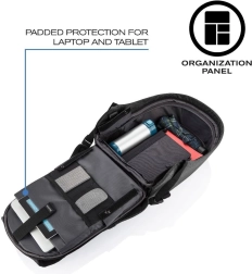 Batoh je navržen s tvrdou skořepinou a bezpečnými zipy. Na přední straně je viditelné logo značky XD Design. Skryté zipy a materiál odolný proti proříznutí chrání cennosti, ideální pro každodenní dojíždění a cestování.