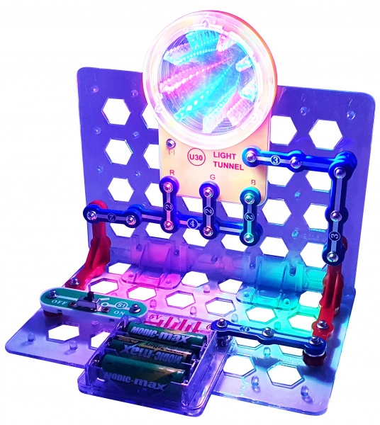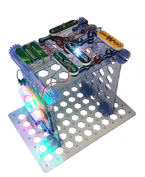Všechny díly jednoduše zacvaknete do průhledné mřížky. Stavba je rychlá, přehledná a ideální pro první kroky v elektronice.