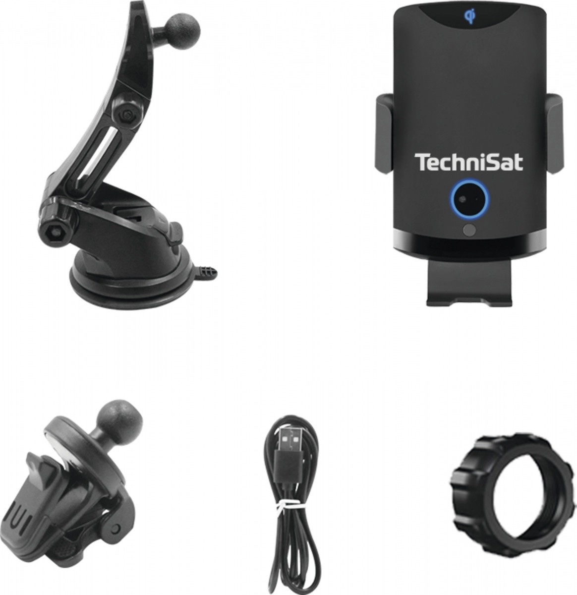 - Držák s bezdrátovým nabíjením, přísavný držák, klip do ventilace, USB‑C kabel, montážní kroužek