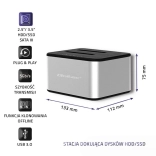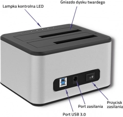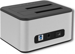 Univerzální dokovací stanice pro 2× HDD/SSD velikosti 2.5" a 3.5" se snadným připojením přes USB 3.0 až 5 Gbps a podporou SATA I/II/III. Umožňuje offline klonování jedním stiskem bez počítače, má Plug & Play funkci bez instalace ovladačů a stabilní design s gumovými nožkami.