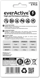Sada lithiových baterií everActive obsahuje 4 x CR2032, 2 x CR2025 a 2 x CR2016. Ideální pro široké využití v různých zařízeních.