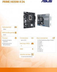 Kompaktní základní deska ASUS PRIME H610M-K D4 pro socket LGA 1700 nabízí spolehlivý základ pro moderní počítač s pamětmi DDR4, rozhraním PCIe 4.0, rychlým slotem M.2 pro NVMe SSD a bohatou konektivitou včetně HDMI, D-Sub, USB 3.2 Gen 1 a Realtek 1 Gb Ethernet. Ideální volba pro cenově dostupné sestavy v kompaktním formátu microATX.