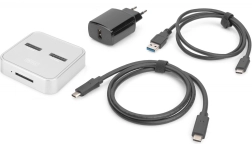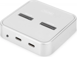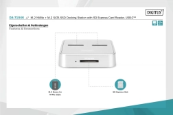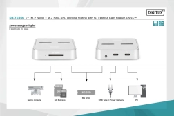 Univerzální dokovací stanice DIGITUS kombinuje dva nezávislé sloty pro SSD M.2 – jeden pro NVMe (B+M Key / M‑Key) a druhý pro SATA (B+M Key) – a k tomu čtečku SD Express 7.1. Získáte tak flexibilní centrum pro správu a migraci dat s podporou disků až do 4 TB na slot a SD karet až do 2 TB.