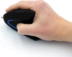 Vertikální tvar podporuje „handshake“ úchop, čímž snižuje ohyb zápěstí a kroucení předloktí. Ideální pro dlouhé hodiny práce u počítače.