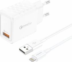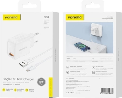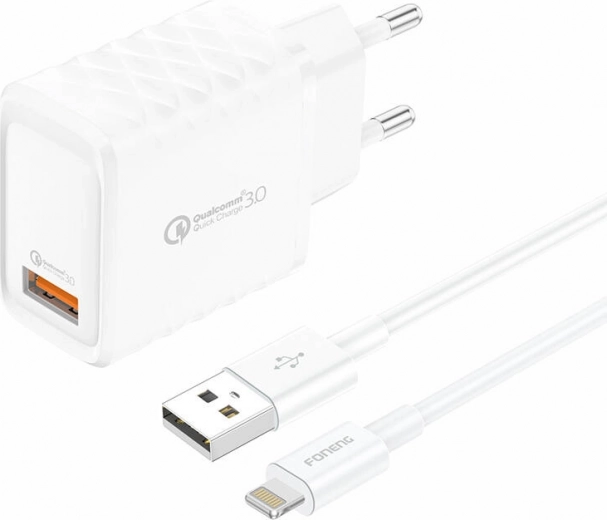 Foneng rychlonabíječka USB-A s kabelem Lightning je pokročilé zařízení, které poskytuje rychlé a efektivní nabíjení až 18W, podporující nejpopulárnější protokoly rychlého nabíjení jako QC2.0/3.0, PD2.0/3.0, AFC, FCP a PPS. Díky technologii GaN (gallium nitrid) je efektivnější a kompaktnější, zatímco produkuje méně tepla.