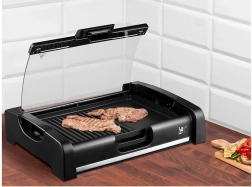 Grilovací deska s nepřilnavým povrchem je odnímatelná, což zajišťuje snadné čištění i při častém používání. Skleněný kryt chrání okolí před mastnotou.