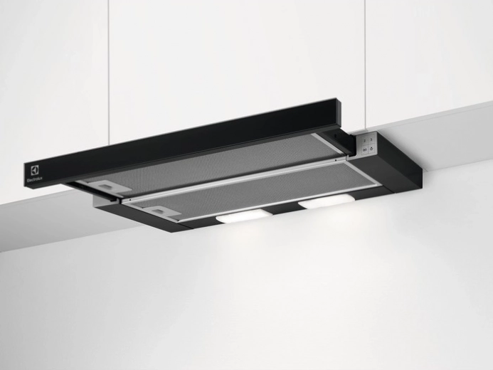 Teleskopický odsavač par v elegantní černé barvě nabízí moderní design a výkonnost, ideální pro jakoukoli kuchyň.