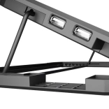 Pro pohodlné používání nabízí podložka 7 úrovní nastavení sklonu, takže si snadno najdete ideální polohu pro psaní i sledování obsahu. Stabilitu na jakémkoli povrchu zajišťují protiskluzové prvky. Napájení je jednoduché přes USB – v balení najdete USB kabel i adaptér USB‑C → USB‑A, takže podložku snadno připojíte k moderním notebookům bez nutnosti externího zdroje.