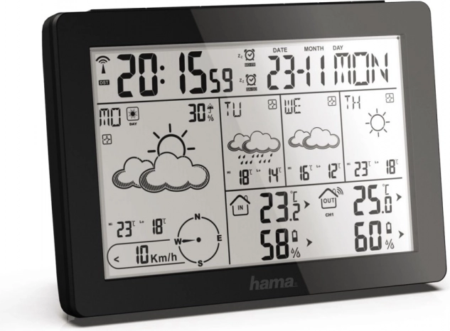 Rádiový přijímač profesionálních meteorologických dat poskytuje přesnou předpověď včetně pravděpodobnosti srážek, větru a ikon počasí. Praktické funkce jako denní a jednorázový alarm, snooze, vícejazyčné menu a signalizace slabé baterie dělají z této stanice chytrého pomocníka pro každý den.