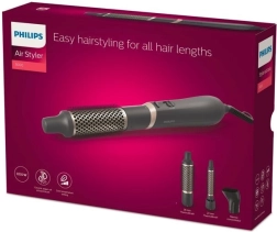 Součástí balení jsou tři nástavce pro různé délky a typy vlasů: termo kartáč 38 mm pro hladké foukané a vlny, úzký koncentrátor pro precizní proud vzduchu a termo kartáč 22 mm pro snadné tvorby loků. Tři nastavení teploty a rychlosti umožní přizpůsobit styling vašim potřebám, zatímco režim Care zajišťuje lepší ochranu během sušení. Kartáč s arganovým olejem pomáhá uhladit vlasy a dodat jim lesk.