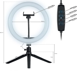 Ovládání je rychlé a intuitivní díky podsvícenému ovladači na USB kabelu, kde zapnete/vypnete světlo a změníte jas i barvu. Držák telefonu umístíte přímo do středu kruhu pro rovnoměrné nasvícení obličeje. Mini stolní stativ s otočnou a nastavitelnou hlavou umožní přesné nastavení úhlu záběru.