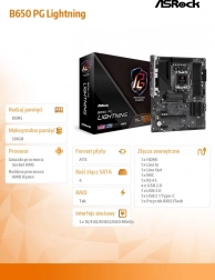ASRock B650 PG Lightning je spolehlivý základ pro výkonné PC. Platforma AM5 s podporou procesorů AMD Ryzen 7000 a čtyř slotů DDR5 umožní postavit rychlou a efektivní sestavu. Kvalitní napájecí kaskáda 14+2+1 se Smart Power Stage a masivní pasivy zajišťují stabilitu i při dlouhodobé zátěži.