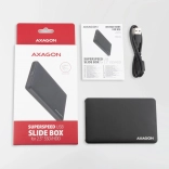 Lehká externí skříňka AXAGON EE25-SL SLIDE BOX s USB 3.2 Gen 1 (USB 3.0) a SATA 6G je určena pro všechny 2.5" SATA pevné disky a SSD. Díky bezšroubové konstrukci je výměna disku jednoduchá a rychlá.
