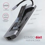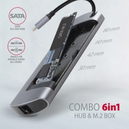 AXAGON HMC-6M2 COMBO 6v1 poskytuje jednoduchou a kompaktní dokovací stanici pro notebooky jako MacBook Pro. Rychle připojte dvě zařízení USB, síť Ethernet, HDMI displej a SSD disk M.2. Díky technologii Power Delivery můžete nabíjet váš laptop až do 100W. HDMI výstup podporuje rozlišení až 4K/30Hz Ultra HD.