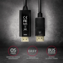 Aktivní adaptér DisplayPort na HDMI od značky AXAGON je ideální řešení pro propojení vašeho zařízení s HDMI monitorem nebo projektorem. Tento kompaktní kabel zajišťuje přenos obrazu i zvuku bez nutnosti další instalace či nastavení. Jeho jednosměrná konstrukce podporuje komunikaci DisplayPort na HDMI.