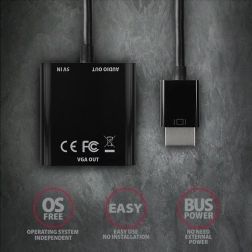 Tento aktivní adaptér umožňuje přenos obrazu až do rozlišení 1920x1200 (WUXGA) s obnovovací frekvencí 60 Hz. Díky inovačnímu designu poskytuje vysoce kvalitní, ostrý obraz. Je jednosměrný – z HDMI na VGA, ne pro zpětnou konverzi.