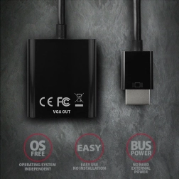 Adaptér je napájen přímo z HDMI, takže nepotřebuje externí napájení. Díky hardwarové konverzi funguje bez ovladačů v libovolném operačním systému a podporuje režimy duplikace i rozšíření plochy. Kompaktní rozměry a pevný kabel délky cca 17 cm z něj dělají ideálního parťáka na cesty i do kanceláře.