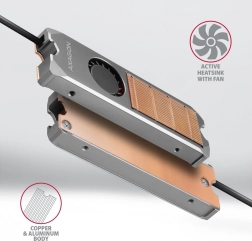 Aktivní chladič pro SSD M.2 2280 kombinuje žebrované měděné jádro a hliníkový kryt s tichým ventilátorem řízeným PWM. Připojení na standardní 4pin header umožňuje automatickou regulaci podle teploty. Díky kovovému rámu odvádí teplo z obou stran disku, a tím maximalizuje chladicí výkon pro NVMe i SATA (AHCI) moduly.